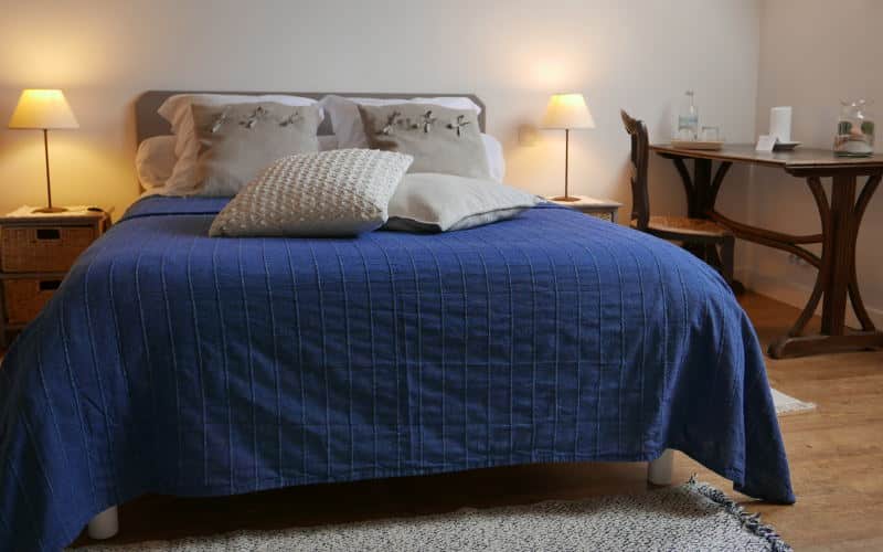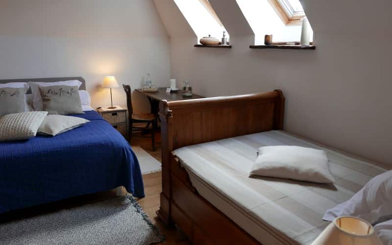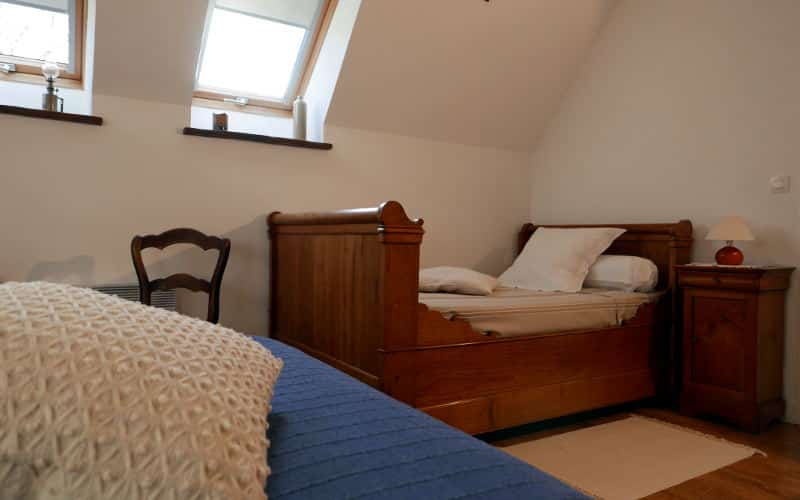 On aime la chambre pour ses volumes généreux, sa clarté et ses boiseries apparentes. Elle se compose d’un grand lit double (160/200) et d’un lit « bateau » (120/180) qui peut accueillir un enfant ou un adulte. Une déco simple et épurée composée de mobilier ancien et d’éléments modernes participe à l’harmonie du lieu.