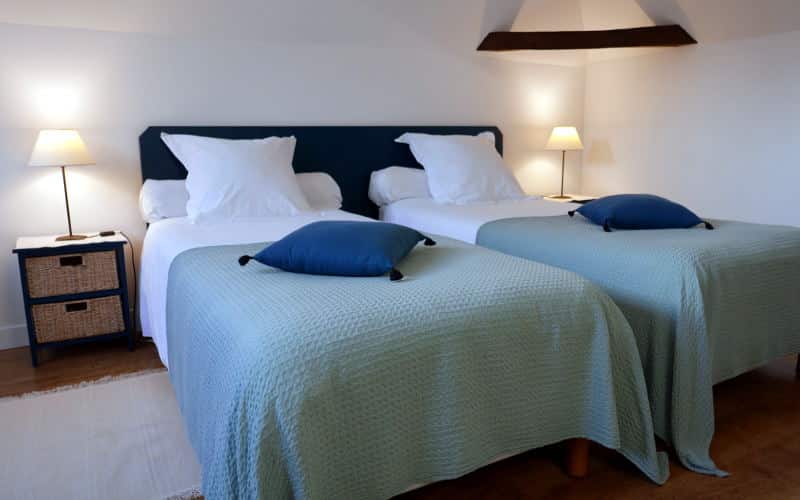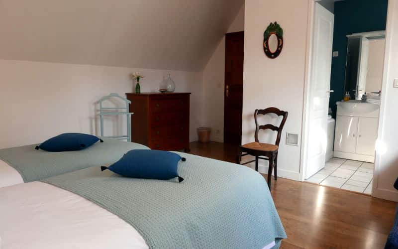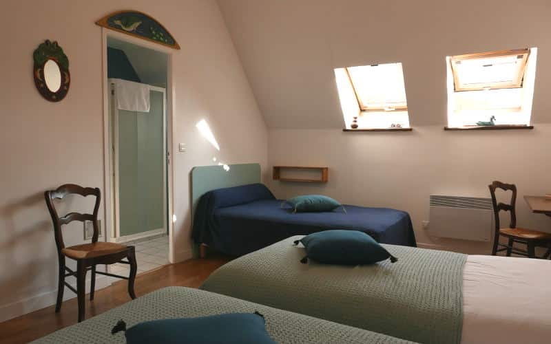 Pour cette grande chambre, on aime la sensation d’espace et de confort qui s’en dégage. Les couleurs fraîches douces et harmonieuses évoquent l’ambiance aquatique de l’environnement du Moulin. La chambre propose deux lits jumeaux (90/200) et un lit simple (120/190) qui peut accueillir un enfant ou un adulte. La literie grand confort hôtelier sera la garantie de votre sommeil. Dans la salle de bain attenante, vous trouverez lavabo douche et WC. Le linge de toilette est fourni, un sèche cheveux est à disposition ainsi que des produits de toilette bios ( Shampoing / gel douche de marque Coslys ).